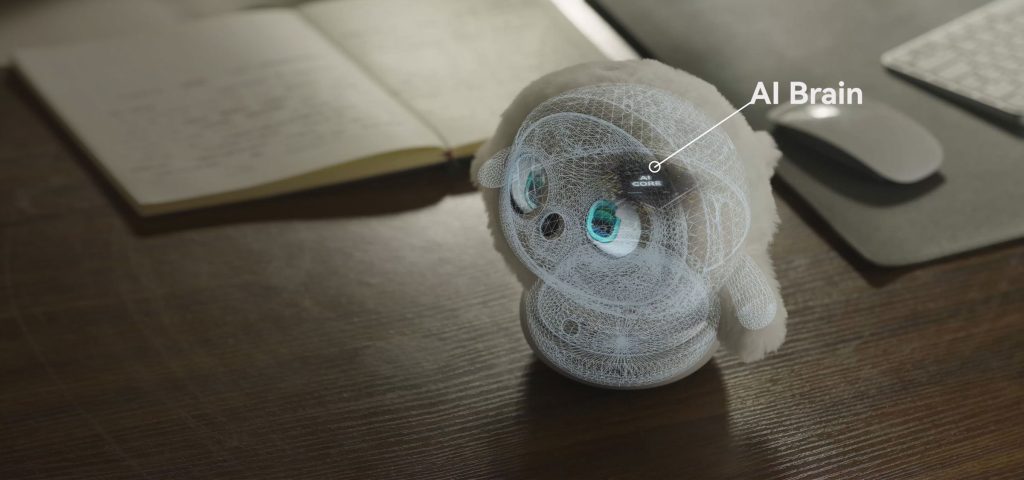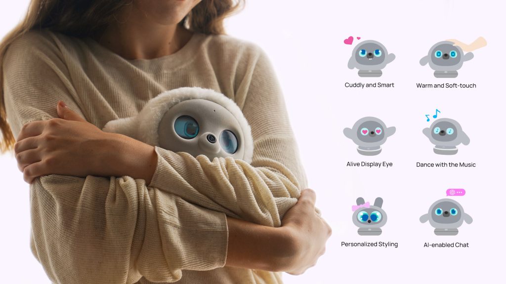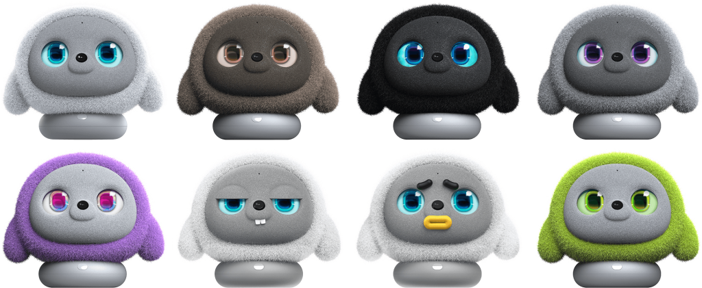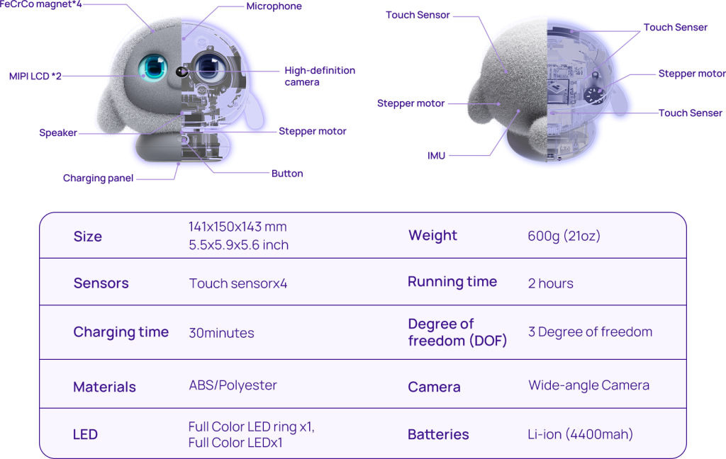 Ropet boasts a plush, round exterior with stubby arms and large, expressive eyes displayed on an LCD screen, exuding a lifelike presence. Its soft, furry body maintains a temperature of approximately 37°C, mimicking the warmth of a living creature. Equipped with a near-invisible camera nestled in its nose, a microphone, and a speaker, Ropet can recognize human actions and emotions, adapting its responses accordingly. Its motorized base allows it to turn its head and move its ears, enhancing its interactive capabilities